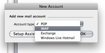 This will open a new window. Select either POP or IMAP as account type. Be sure to click on Ok, not Setup Assistant, see below...