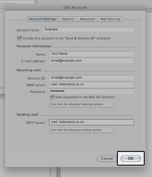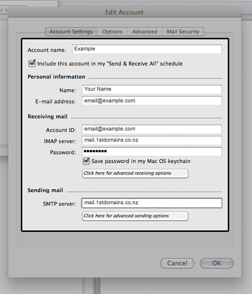 - Enter mail.1stdomains.co.nz in the IMAP server field or POP server